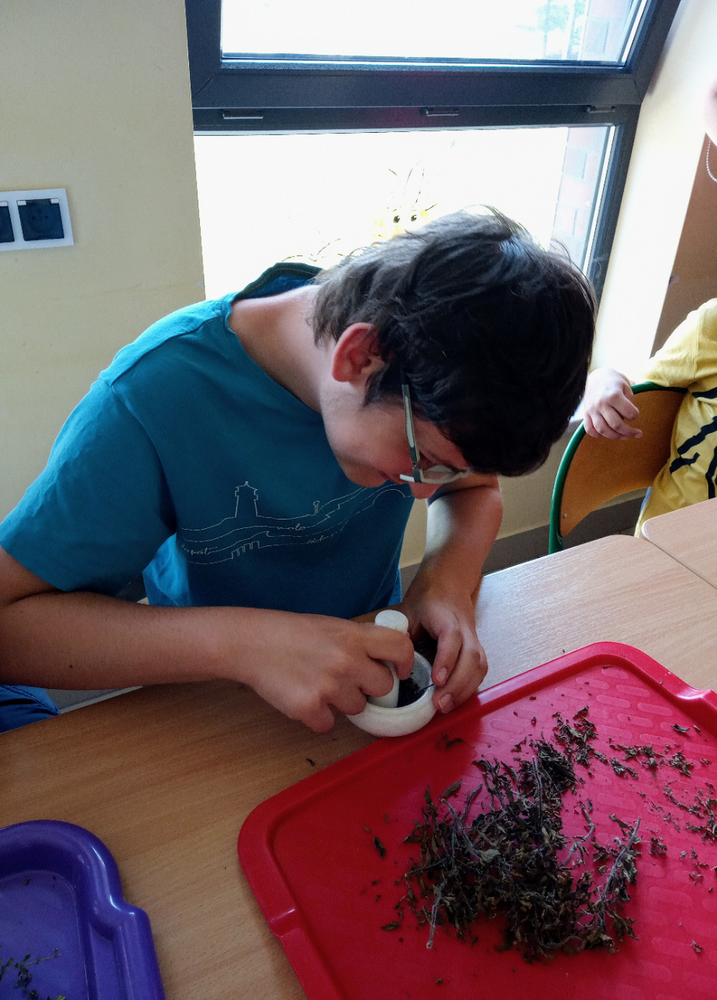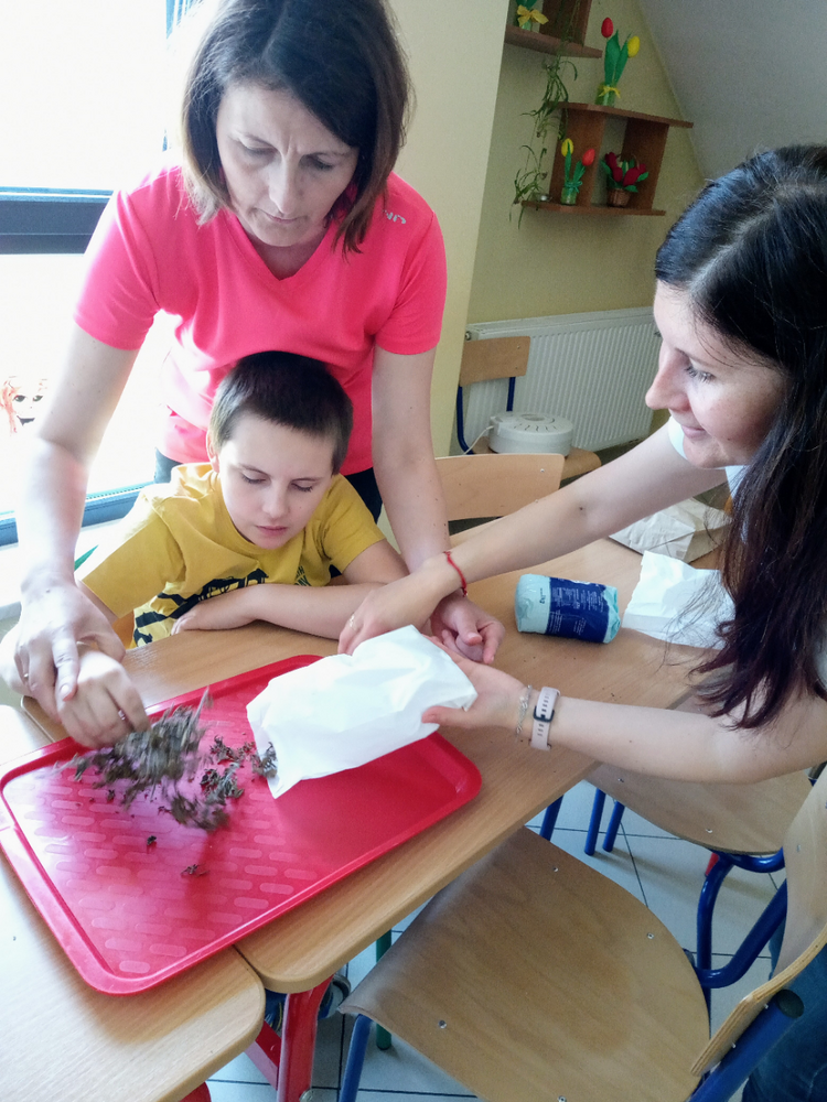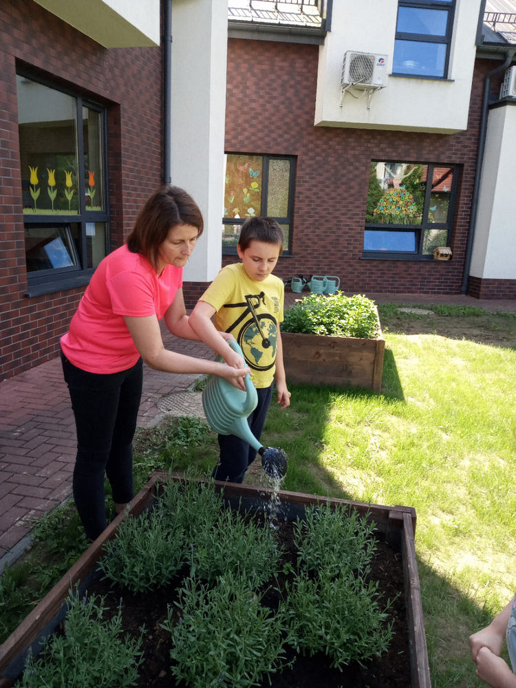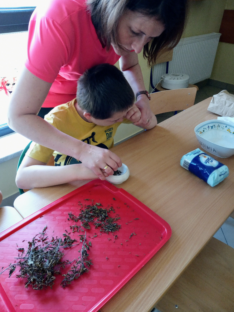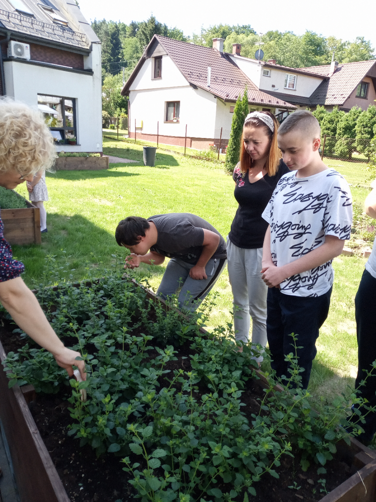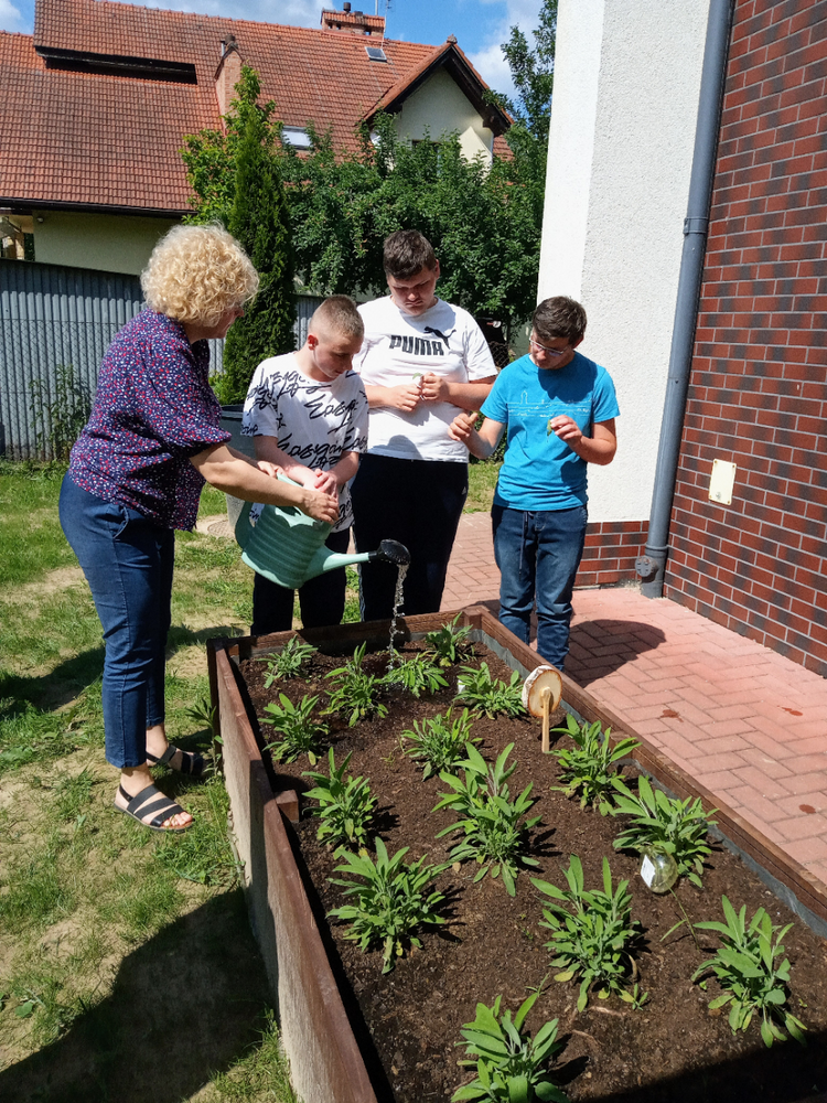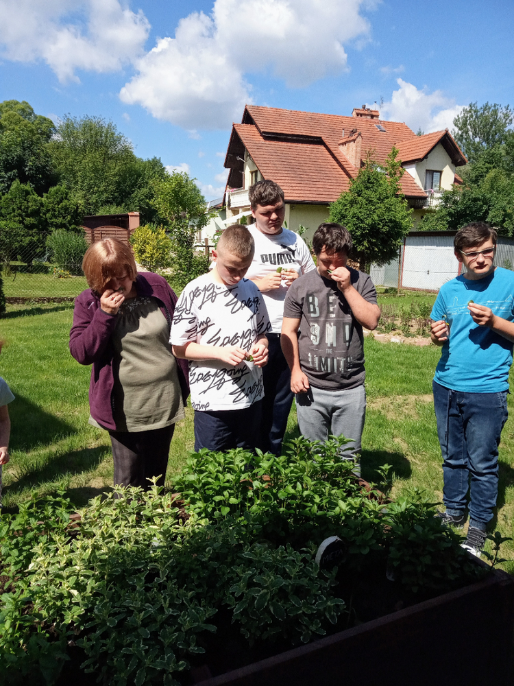 „Zaczarowany Ogród” nadal tętni życiem. Grupa edukacyjno – terapeutyczna brała udział w zajęciach z hortiterapii. Uczniowie zapoznali się z nazwami, wyglądem, budową, właściwościami i zastosowaniem ziół. Podczas spaceru po ogrodzie wielozmysłowo czerpali korzyści wynikające z przebywania w nim oraz podejmowali działania na rzecz pielęgnacji ogrodu, m.in. podlewali i ścinali zioła, które zostały wykorzystane na zajęciach praktycznych. W pracowni kulinarnej uczniowie wykonali lemoniadę i sól ziołową. Zwieńczeniem zajęć była degustacja lemoniady, a wykonana sól zostanie zużyta w domowej kuchni. Uczestnicy zajęć zapewnili nas, że będą odwiedzać ogród i korzystać z rosnących w nim ziół.