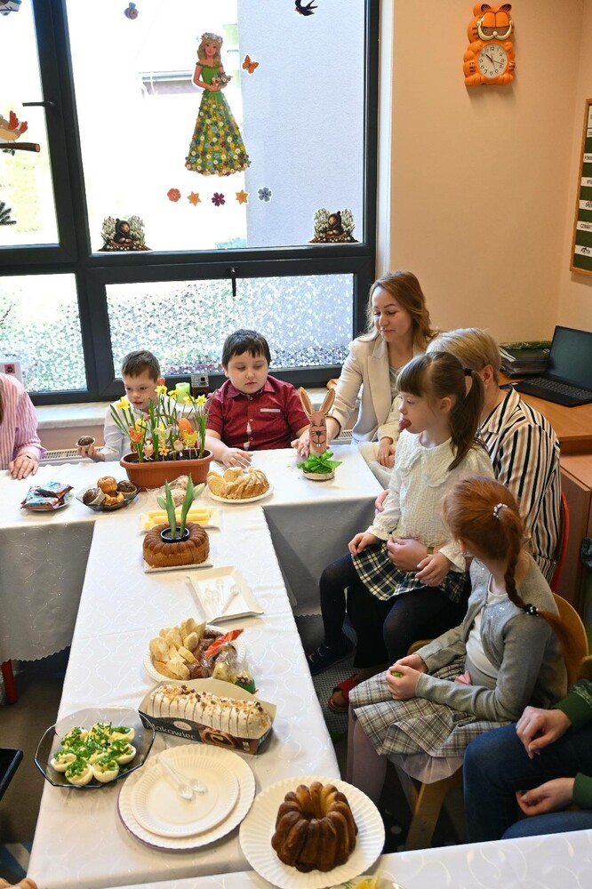 Przez ostatnie dni dzieci poznawały różne tradycje związane ze świętami Wielkiej Nocy, wspólnie dekorowały sale, siały owies, malowały pisanki. Wszystkie te wspólnie wytworzone akcenty wielkanocne znalazły się na stole. Zwieńczeniem licznych opowieści o zwyczajach Wielkanocnych było wspólne świąteczne śniadanie. Nie mogło zabraknąć jajka, baranka, kiełbaski, babki, makowca. Ten dzień miał wyjątkowy charakter, dzieci słuchały piosenek związanych z tradycjami wielkanocnymi. Spotkanie przy wspólnym świątecznym stole sprawiło dzieciom wiele radości.
