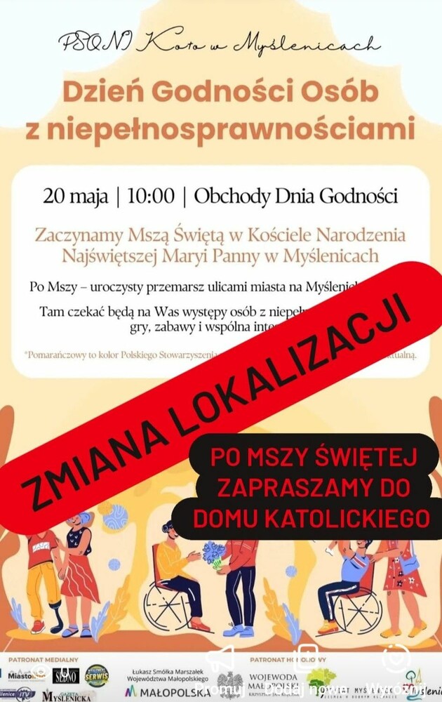 W związku z prognozowanymi niekorzystnymi warunkami pogodowymi uprzejmie informujemy, że jutrzejsze wydarzenie Dzień Godności Osób z Niepełnosprawnościami zostaje przeniesione do Domu Katolickiego im. ks. Prałata Józefa Bylicy w Myślenicach (ul. 3-go Maja 1a).
