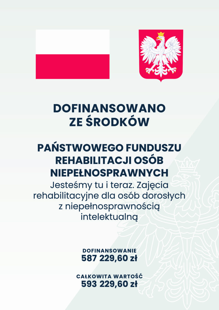 Informujemy, iż Polskie Stowarzyszenie na rzecz Osób z Niepełnosprawnością Intelektualną Koło w Myślenicach od dnia 01.04.2025 roku realizuje trzyletni projekt pn. „ Jesteśmy tu i teraz. Zajęcia rehabilitacyjne dla osób dorosłych z niepełnosprawnością intelektualną”.